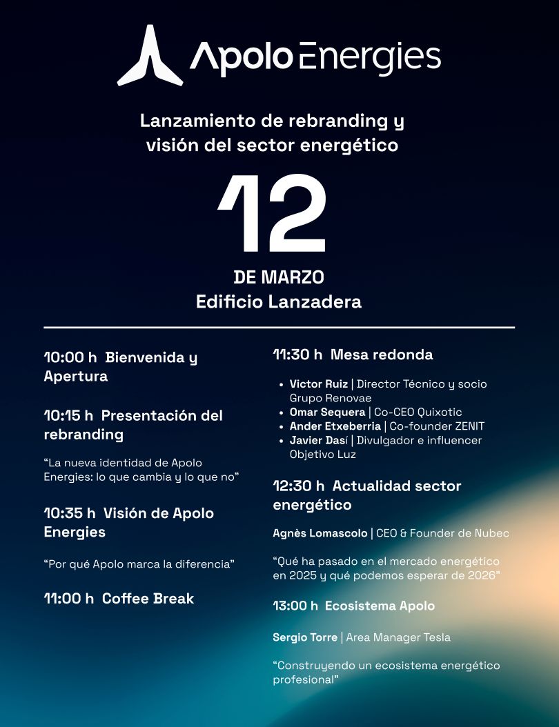 Os invitamos al primer Evento Apolo Energies, que celebraremos el 12 de marzo en el Auditorio de Lanzadera (Valencia). Apolo Energies es una comercializadora eléctrica prescriptora enfocada en optimizar los